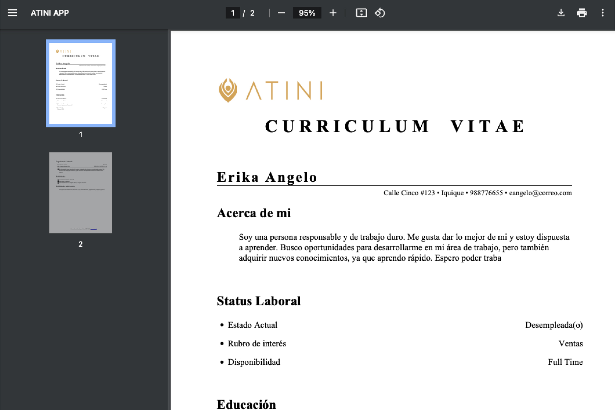 Con ATINI podrás generar tu curriculum en formato PDF para uso de la aplicación y personal.